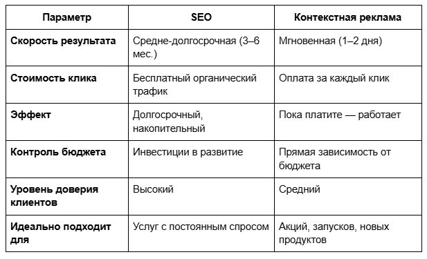 SEO и контекст — не конкуренты, а союзники. Контекст обеспечивает быстрый старт, SEO — долгосрочный рост. Выбирайте стратегию, исходя из целей бизнеса: хотите клиентов сегодня — запускайте рекламу, хотите клиентов каждый день — развивайте сайт.